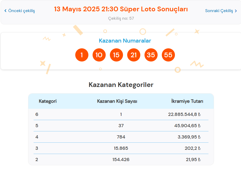 Süper Loto’nun 13 Mayıs 2025 tarihinde gerçekleşen çekilişinde, 6 bilen 1 talihli tam 22.885.544,8 TL ikramiye kazandı.