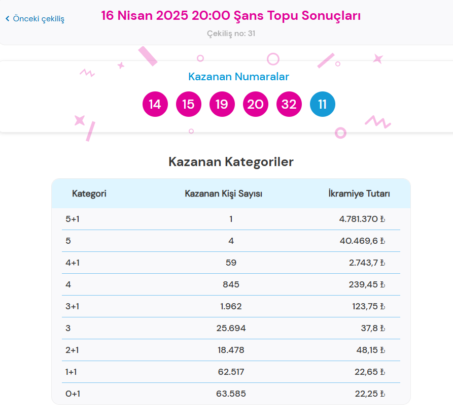 16 Nisan 2025 günü gerçekleşen canlı çekiliş sonrası sonuçlar aşikâr oldu. Çekilişte 5+1 bilen 1 kişi 4.781.370 TL ikramiye kazandı.