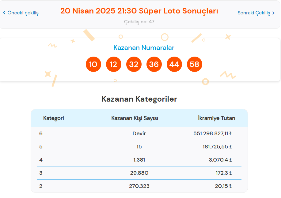 20 Nisan 2025 tarihli Harika Loto sonuçları aşikâr oldu. Üstün Loto’da 6 bilen çıkmayınca tam 551.298.827,11 TL ikramiye devretti.
