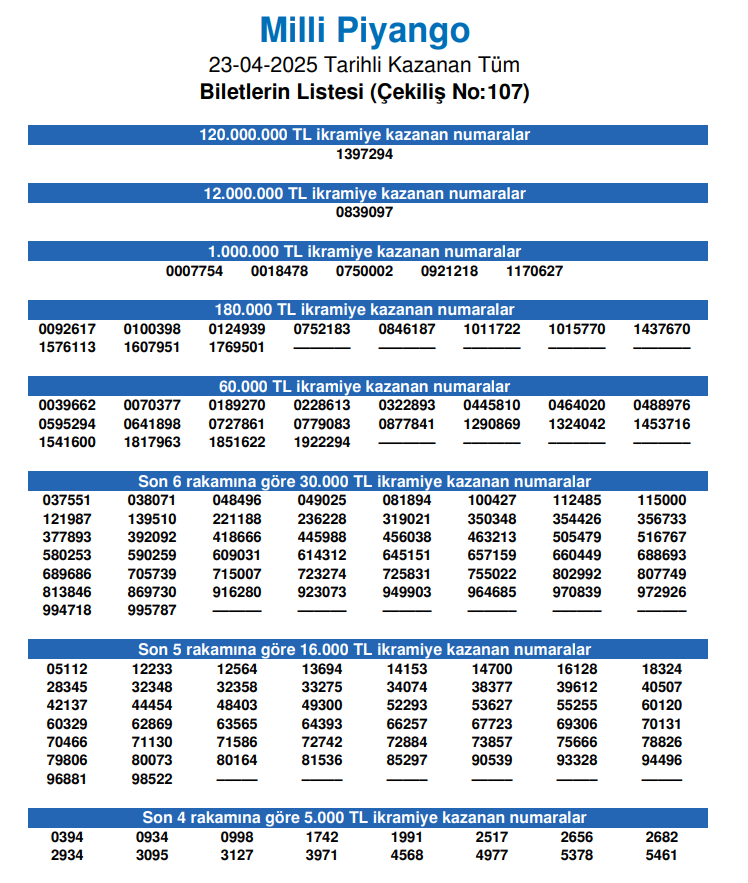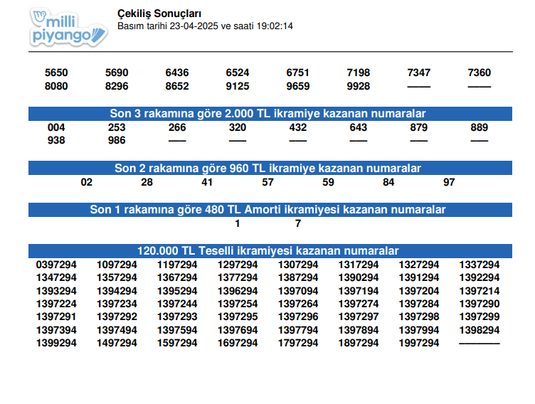 23 Nisan Ulusal Piyango özel çekilişinde, 120.000.000 TL ikramiye kazanan numaralar 1397294 oldu. 12.000.000 TL ikramiye kazanan numaralar ise 0839097 olarak belirlendi.