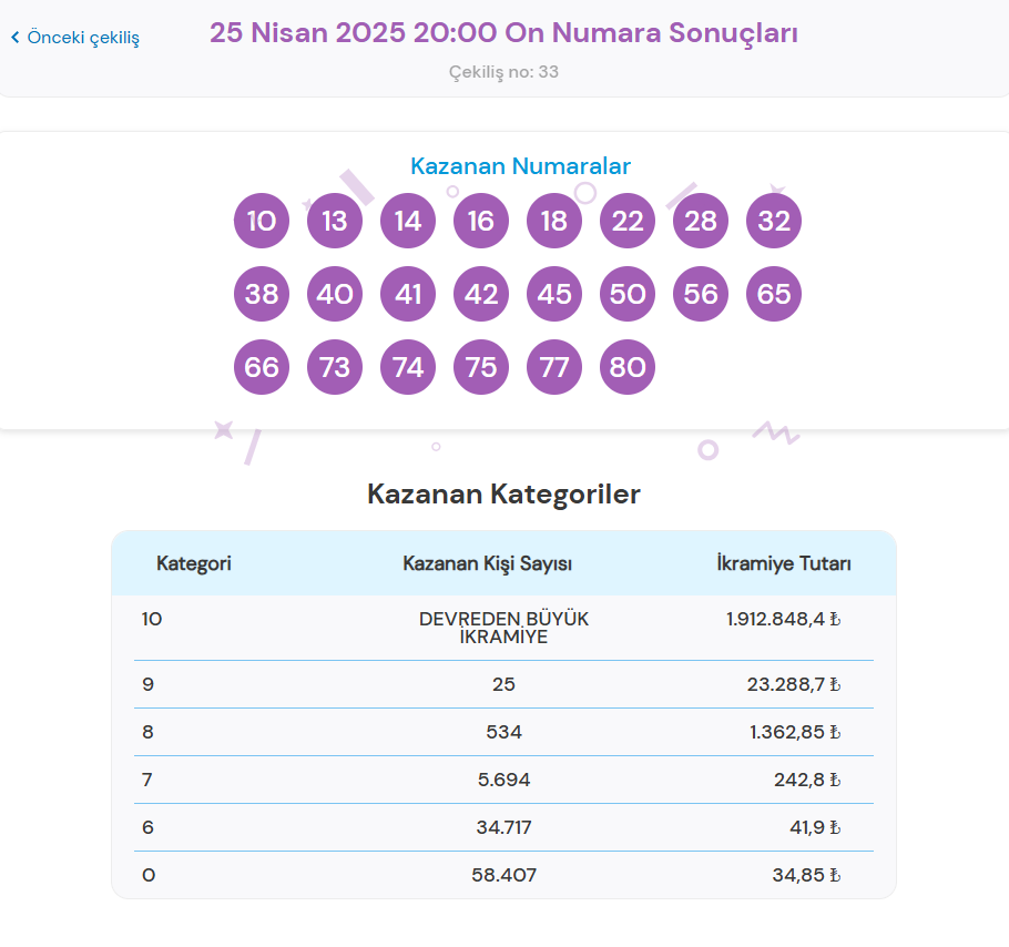 25 NİSAN 2025 ON NUMARA SONUÇLARI
