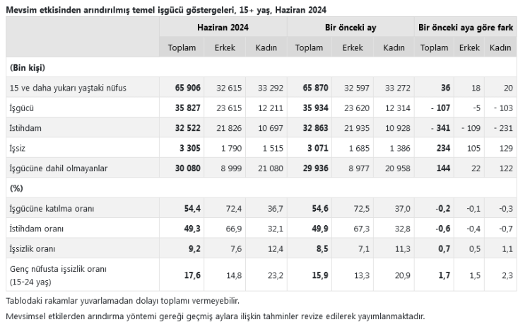 Verilere göre İşgücü 2024 yılı Haziran ayında bir önceki aya göre 107 bin kişi azalarak 35 milyon 827 bin kişi, işgücüne katılma oranı ise 0,2 puan azalarak yüzde 54,4 olarak gerçekleşti. İşgücüne katılma oranı erkeklerde yüzde 72,4 iken kadınlarda yüzde 36,7 oldu.