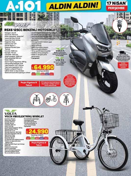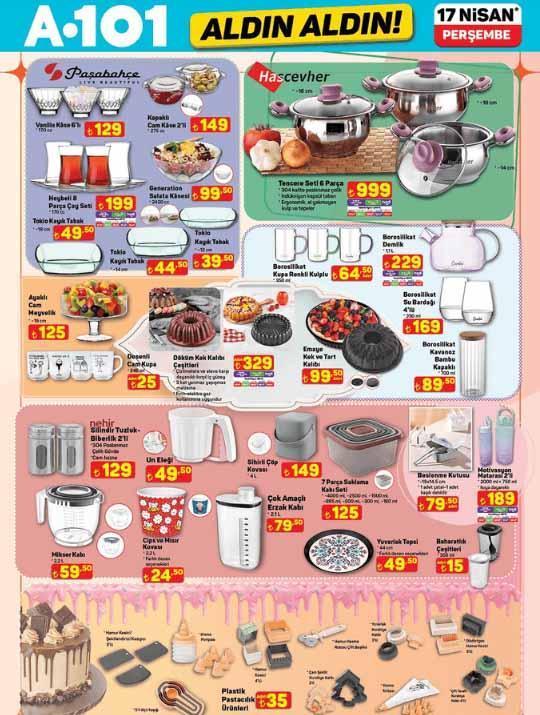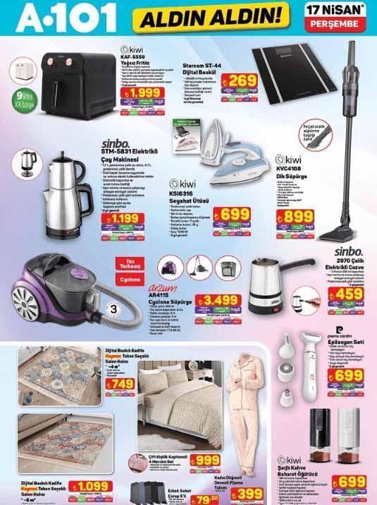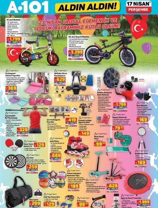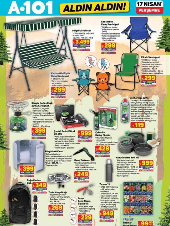 17 Nisan A101 aktüel eserler kataloğu ile Aldın Aldın broşürü eserleri raflara gelmeye hazırlanıyor. A101 Aldın Aldın 17 Nisan kataloğunda elektrikli bisiklet 24.990 TL, oyuncu koltuğu 2.799 TL ve gölgeli salıncak 3.499 TL fiyatı ile dikkat çeken eserler ortasında. Ayrıyeten Perşembe Aldın Aldın broşürü ile şarjlı kahve baharat öğütücü, çeşitli kamp materyalleri, 6 kesim tencere seti, emaye kek ve tart kalıbı, plastik pastacılık eserleri, epilasyon seti ve çocuklar için oyuncak çeşitleri A101 marketlerde satışa sunulacak. Pekala A101’de 17 Nisan’da neler var, hangi eserler indirimli_