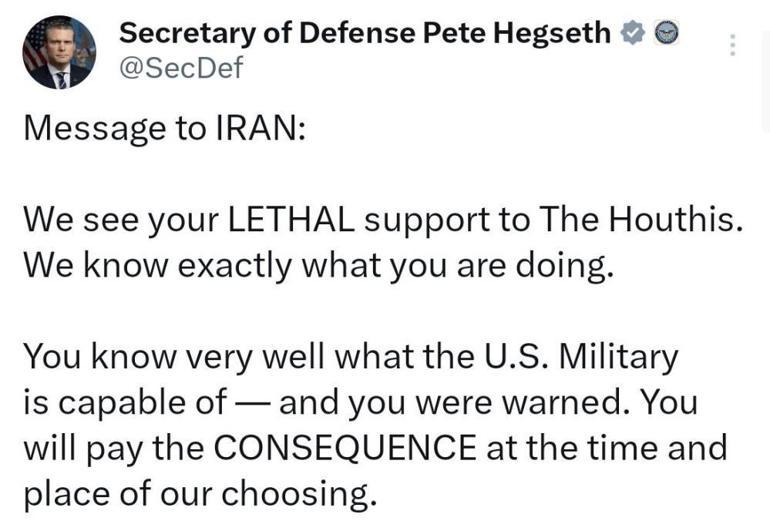 Sosyal medya platformu X üzerinden “İran’a mesaj” başlıklı bir paylaşım yapan Hegseth, “Husilere verdiğiniz ölümcül dayanağı görüyoruz. Ne yaptığınızı çok uygun biliyoruz” sözlerini kullandı.