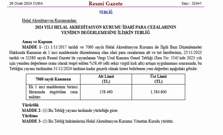 Tebliğle, akredite olmaksızın helal uygunluk değerlendirme hizmeti veren kuruluşlara uygulanan idari para cezalarının alt ve üst limitleri, 2023 yılı için yeniden değerleme oranı olarak tespit edilen yüzde 58,46 artışın yansıtılması sonrasında yeniden belirlendi.