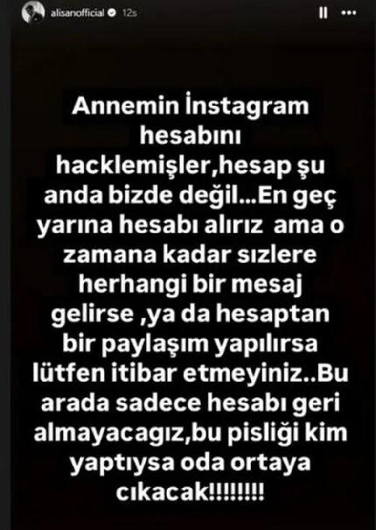 “Annemin Instagram hesabını hacklemişler, hesap şu anda bizde değil… En genç yarına hesabı alırız fakat o vakte kadar sizlere rastgele bir bildiri gelirse, ya da hesaptan bir paylaşım yapılırsa lütfen prestij etmeyiniz… Bu ortada yalnızca hesabı geri almayacağız, bu pisliği kim yaptıysa o da ortaya çıkacak!”