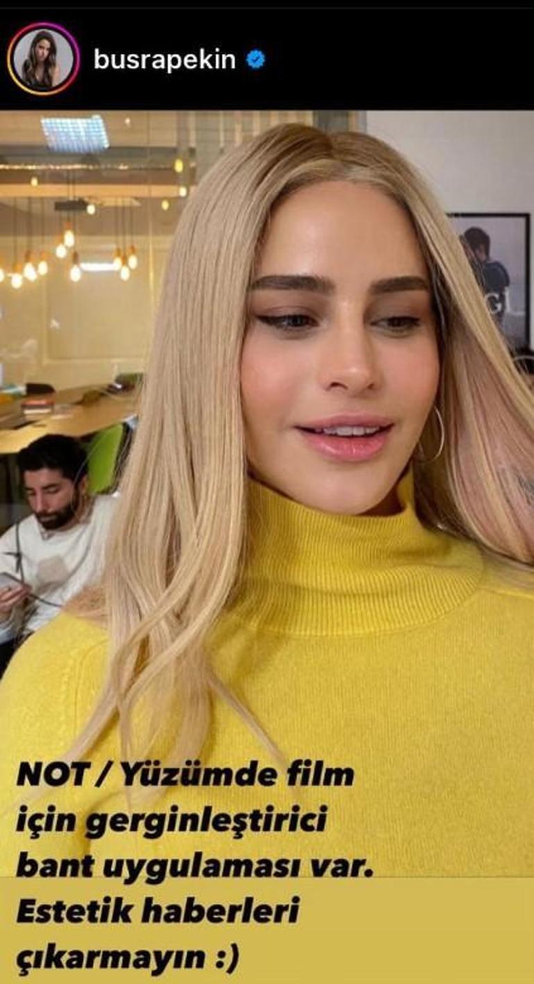 Büşra Pekin fotoğrafını da “Yüzümde sinema için gerginleştirici bant uygulaması var. Estetik haberleri çıkarmayın” notuyla paylaşmıştı…
