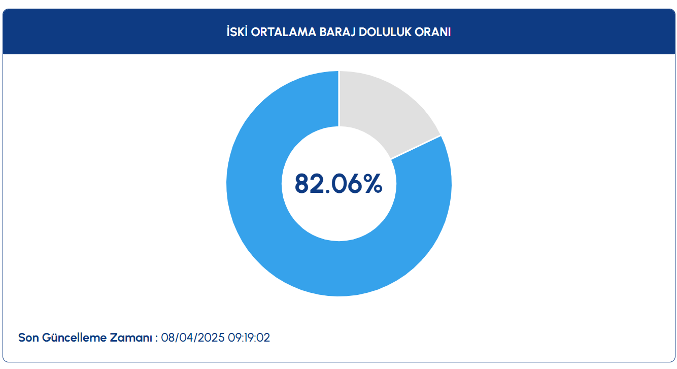 İstanbul Su ve Kanalizasyon Yönetimi (İSKİ) datalarına nazaran, 8 Nisan tarihi itibariyle barajlarda doluluk oranı yüzde 82.06 oldu.