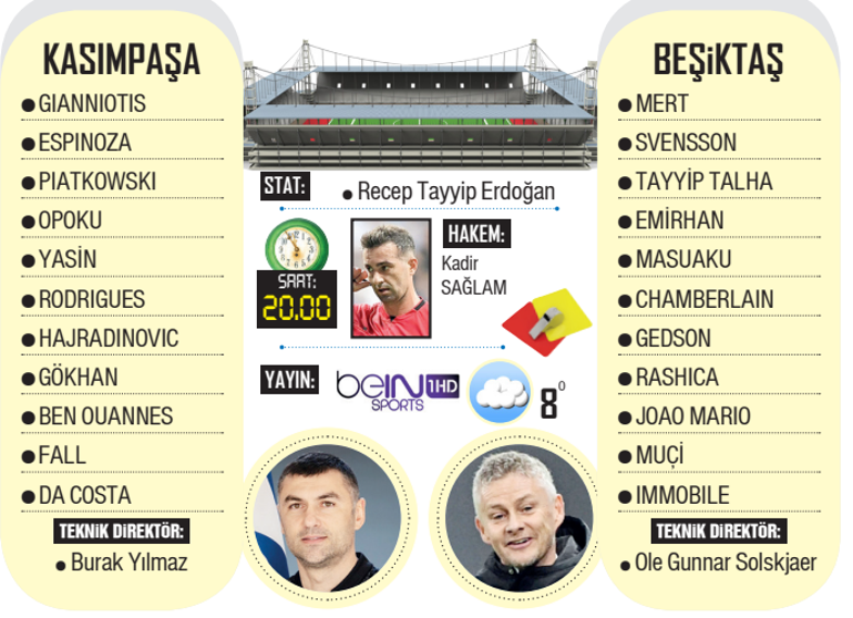 Beşiktaş, bugün deplasmanda Kasımpaşa ile karşı karşıya gelecek. Kartal, hem kupadan elendikten sonra moral bulmak hem de Avrupa Ligi’ne iştirak için argümanını devam ettirmek istiyor. Beşiktaş’ta sakatlıkları süren Uduokhai, Ricardo ve Zaynutdinov’un yanı sıra cezalı Semih bugün forma giyemeyecek. Birebir saatte Göztepe, G.Antep’i ağırlayacak.