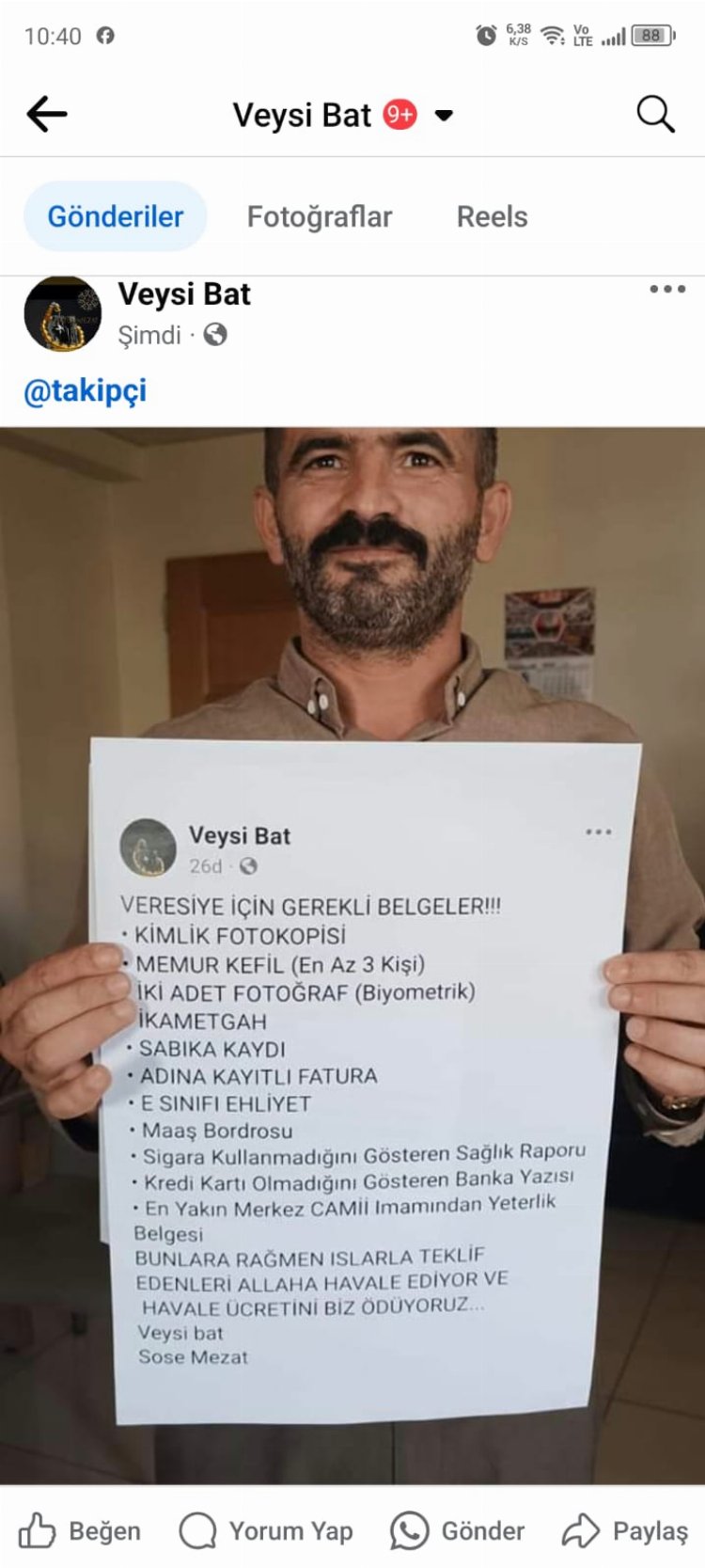 Mardin’e bağlı Yeşilli ilçesinde ikamet eden ve İnternet üzerinde teşbih satarak geçimini sağlayan 36 yaşındaki Mezatçı Veysi Bat, piyasadan 100 bin TL alacağını tahsil edebilmek için borcunu ödemeyen müşterilerinin listesini internet üzerinden teşhir etmeye karar verdi.