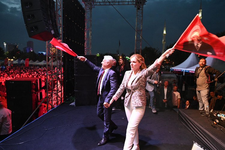 Konser öncesinde alanı dolduran gençleri eşi Seden Bozbey ile birlikte selamlayan Büyükşehir Belediye Başkanı Mustafa Bozbey, ellerindeki Türk bayraklarıyla gençlerin bayramını kutladı.