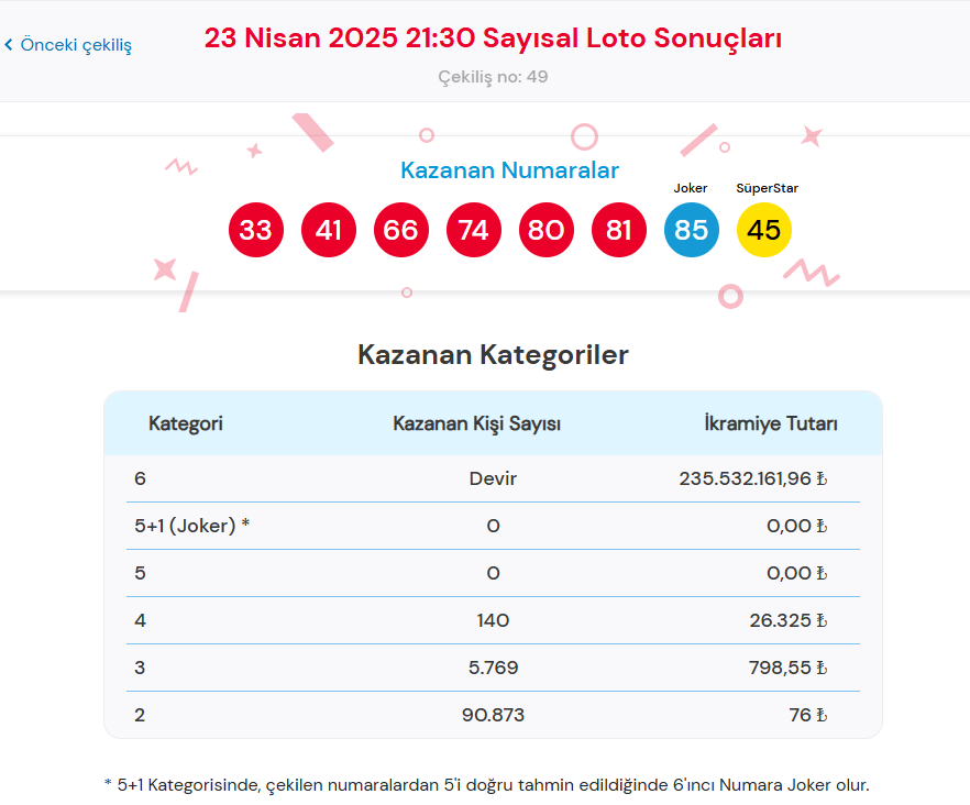 23 Nisan 2025 günü gerçekleşen çekiliş sonrası Çılgın Sayısal Loto sonuçları erişime açıldı. Çekilişte 6 bilen çıkmayınca tam 235.532.161,96 TL ikramiye devretti.