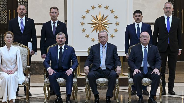 Cumhurbaşkanlığı Külliyesi’ndeki kabulde Belarus Büyükelçisi Anatoly Glaz, Brezilya Büyükelçisi Gilda Motta Santos Neves, Ekvador Büyükelçisi Pedro Vintimilla, Gürcistan Büyükelçisi Archil Kalandia ve Vietnam Büyükelçisi Dang Thi Thu Ha, Cumhurbaşkanı Erdoğan ile bir ortaya geldi.