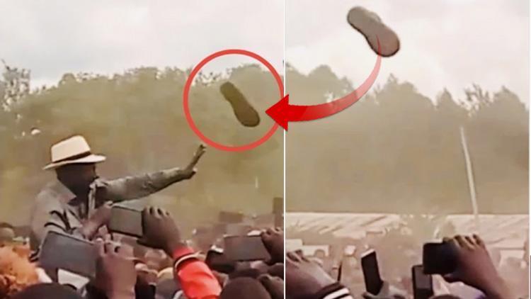 Ruto mitingde “Gübre fiyatlarını düşürüyoruz dedik, hakikat mu yanlış mı?” kelamlarını sarf ettiği esnada kalabalıktan birinin kendisine fırlattığı ayakkabıyı koluyla savuşturdu.