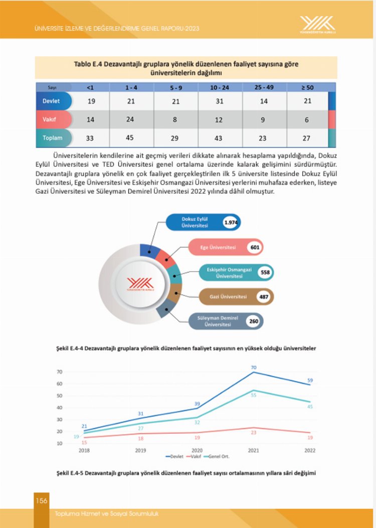 Dokuz Eylül Üniversitesi (DEÜ), Yükseköğretim Kurulu (YÖK) tarafından hazırlanan ‘2023-Üniversite İzleme ve Değerlendirme Genel Raporu’nda önemli başarılara imza atmış, 3 farklı göstergede Türkiye birincisi olurken; 7 göstergede ise Türkiye’de ilk 5 içinde yer almıştı. DEÜ’nün Türkiye’nin zirvesinde bulunduğu alanlardan birisi de ‘Dezavantajlı gruplara yönelik düzenlenen faaliyet sayısı en yüksek olan üniversiteler’ başlığı oldu. 2022 yılına ait veriler ışığında düzenlediği 1974 faaliyet ile bu göstergede açık ara zirvede yer alan DEÜ,bu alandaen yakınüniversiteye üç katından fazla, 1373 fark attı. Engelsiz toplum misyonu kapsamındaki çalışmalarıyla fark yaratan DEÜ,sosyal sorumluluk projesi faaliyetlerinin en yüksek olduğu üniversiteler arasındaysa Türkiye üçüncüsü oldu.