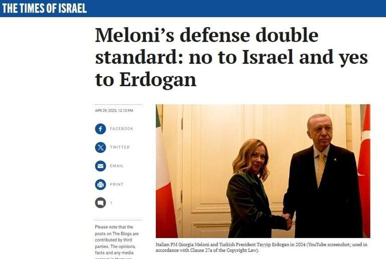 Tel Aviv merkezli Times of Israel gazetesi, Cumhurbaşkanı Erdoğan ve Meloni ortasındaki görüşmeyi “Meloni’nin ikili standart uygulaması” diye okuyucularına sundu. Görüşmenin kapsamına ait bilgiler aktarılan haberde, İtalya’nın İsrail’e karşı uzaklıklı dururken, Türkiye ile savunma ve ticaret alanında iş birliğini ilerletmesinden duyulan rahatsızlık lisana getirildi.