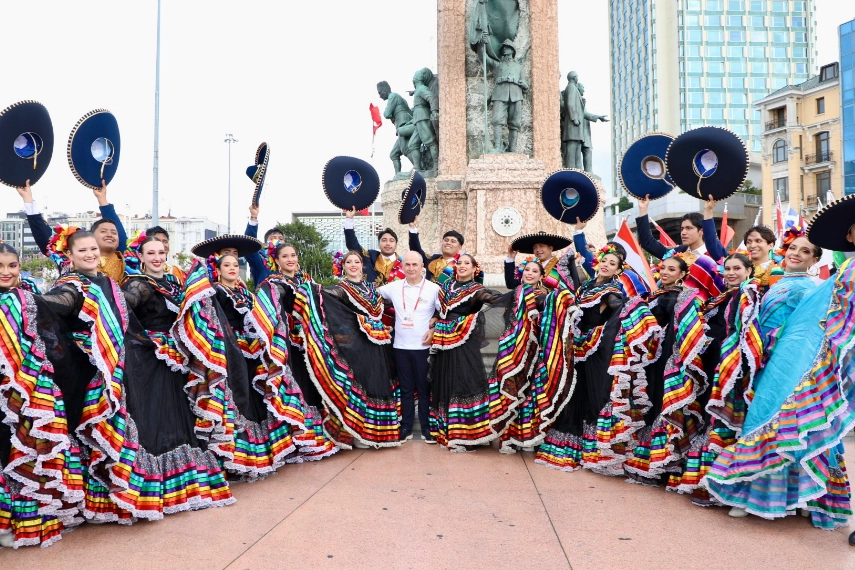 75 ülke temsilcisinin ülke bayraklarıyla katıldıkları çelenk takdim töreninde Meksika, Bulgaristan, Güney Kore ve Kazakistan’dan katılan dans ekipleri renkli ulusal folklorik kostümleri ve geleneksel müzikleri eşliğinde Taksim Meydanı’nda görsel bir şölen yaşattı.