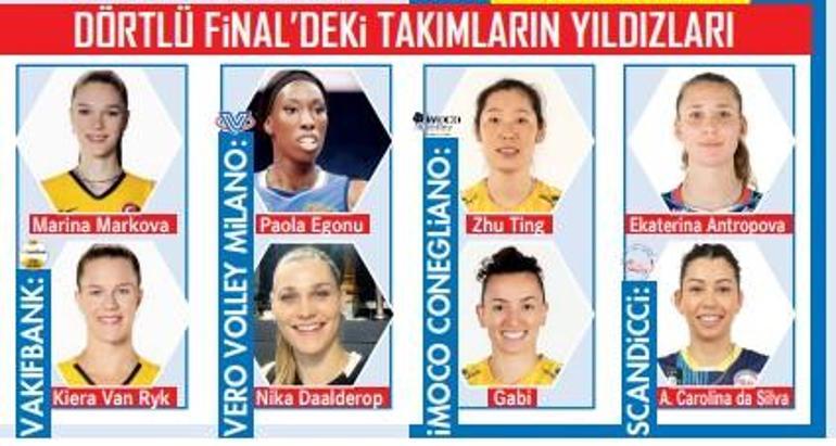 Temsilcimiz Vakıfbank ile İtalya’dan Numia Vero Volley Milano, A. Carraro Imoco Conegliano ve Savino Del Bene Scandicci kadrolarının katıldığı Dörtlü Final karşılaşmaları bugün ve yarın Ülker Spor Salonu’nda oynanacak. İstanbul’un 7 yıl ortadan sonra konut sahipliği yaptığı tertibin birinci gününde saat 16.00’da Numia Vero Volley Milano ile A. Carraro İmoco Conegliano karşı karşıya gelecek. Vakıfbank da saat 19.00’da Savino Del Bene Scandicci ile çaba edecek.