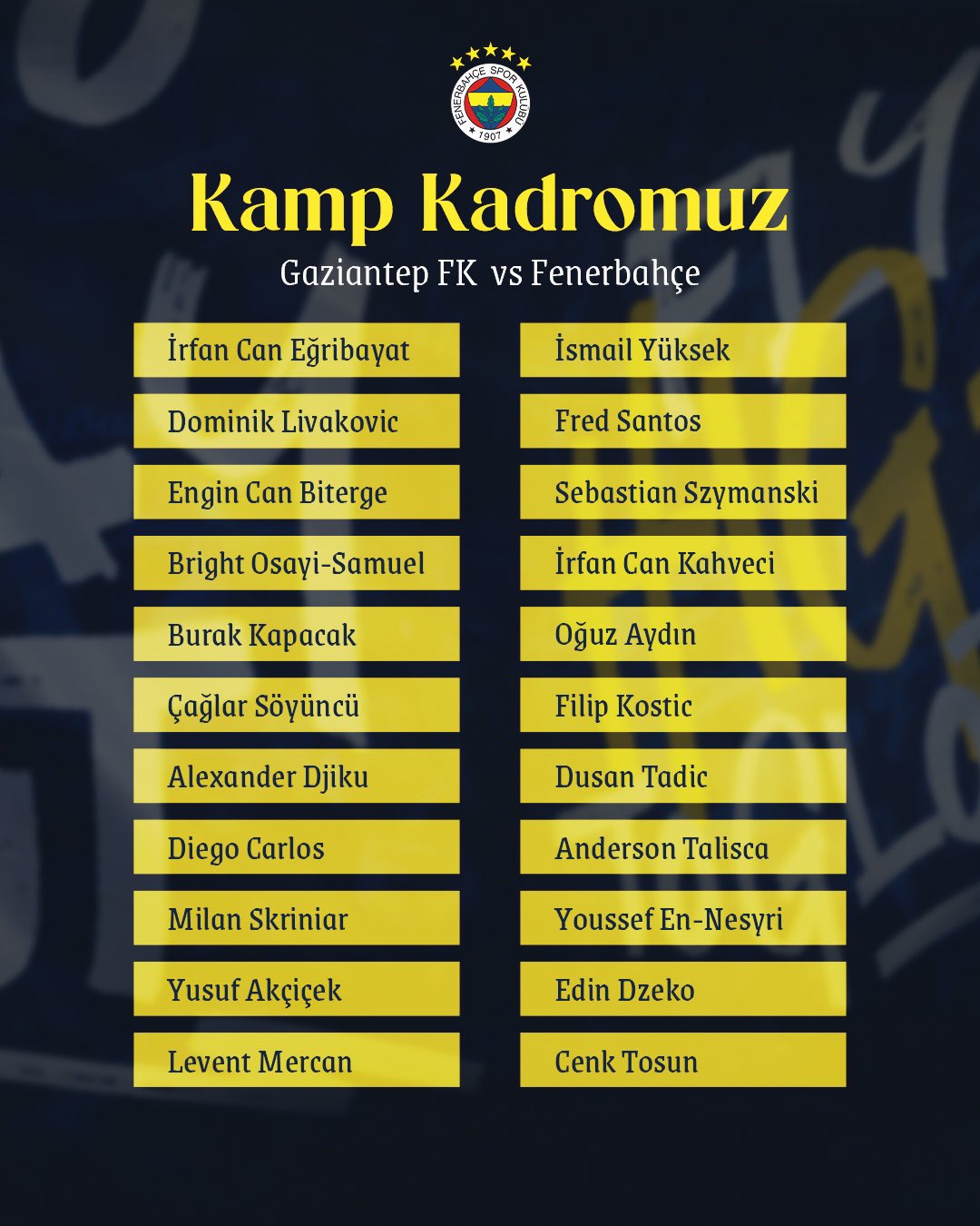Sarı – lacivertlilerde Amrabat ve Mert Hakan Yandaş sakatlıkları nedeniyle, Allan Saint-Maximin ise yabancı kontenjanından Gaziantep’e götürülmedi. Mert Müldür de takımda yer almadı.