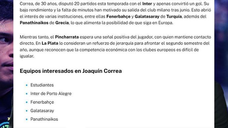 Arjantin basınından yansıyan bilgilere nazaran Joaquin Correa’ya Fenerbahçe ve Galatasaray ile bir arada Yunanistan ve Brezilya’dan da ilgi var.