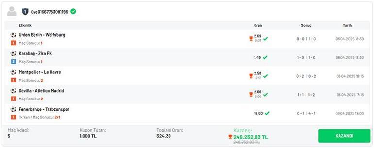 Misli üyesi, böylelikle 324.39’lık oranı bilerek Şampiyon Oran farkıyla 249.252,83 TL kazandı ve bu kuponuyla Misli Arena’da günün “En Düzgün 20 Kuponu” ortasında yer aldı.