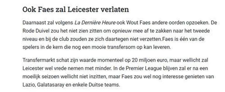 Belçika basınında yer alan habere nazaran Galatasaray, Premier Lig’den düşmesi mutlaklaşan Leicester’ın savunmacısı Wout Faes ile ilgileniyor.