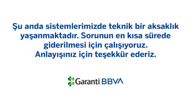 Öte yandan Garanti BBVA taşınabilir uygulamasına girişte yaşanan erişim sorununa ait yapılan birinci açıklama şu biçimdeydi: “Şu anda sistemlerimizde teknik bir aksaklık yaşanmaktadır. Sorunun en kısa müddette giderilmesi için çalışıyoruz. Anlayışınız için teşekkür ederiz.”