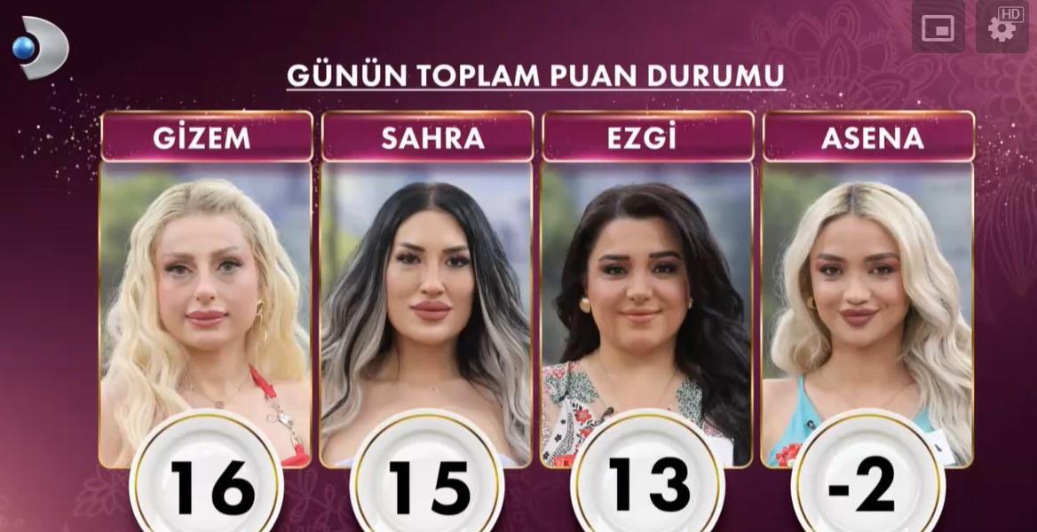 Haftanın tam ortasında günün en yüksek puanını kazanarak çeyrek altının sahibi Ezgi oldu. Asena ise eksi 2 ceza puanı aldı.