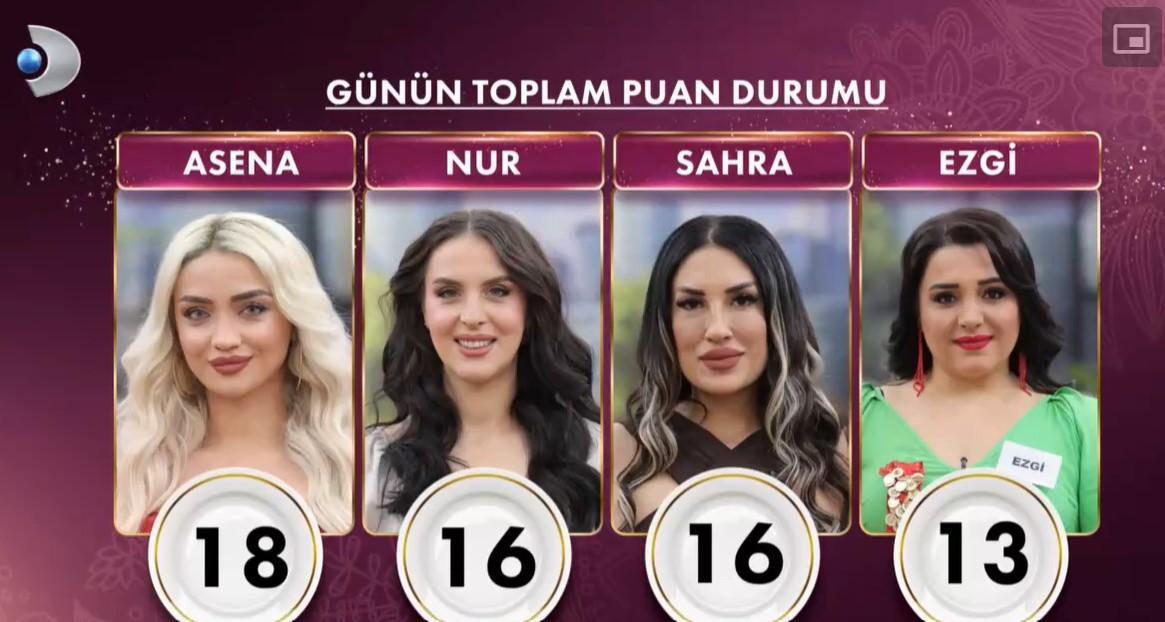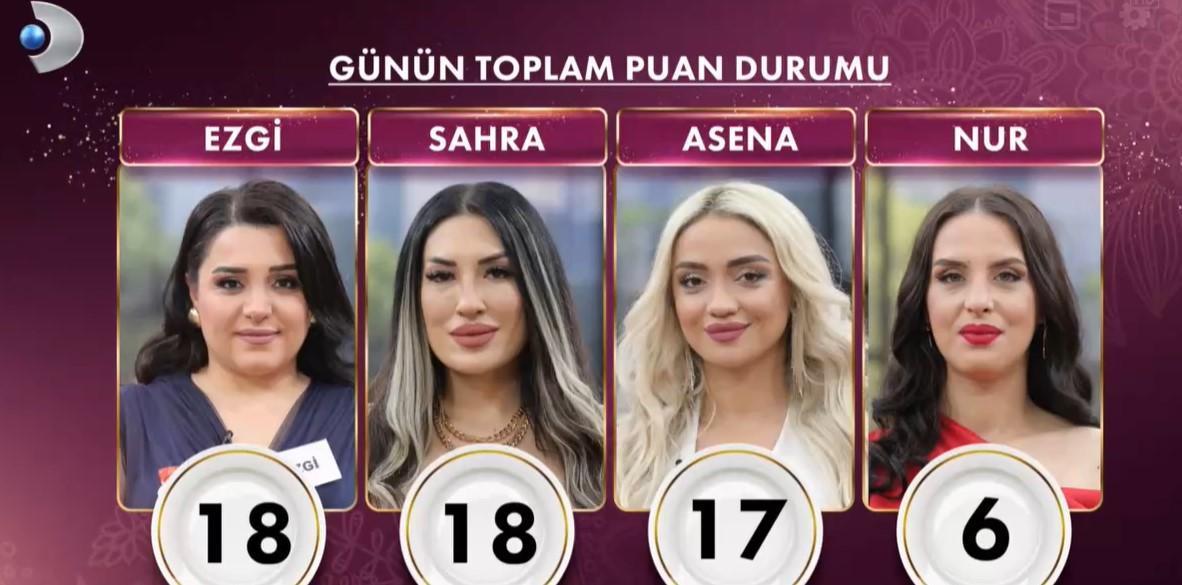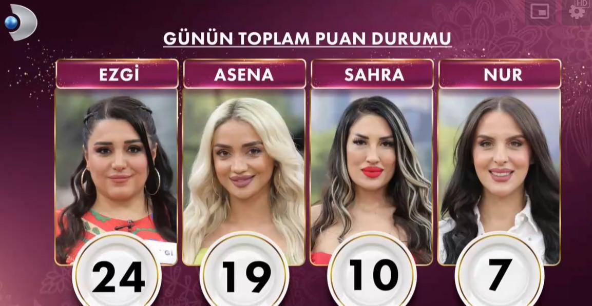Haftanın ikinci gününde en yüksek puanı alarak çeyrek altının sahibi yeni gelin Asena oldu. Sahra eksi 2 almışken, Ezgi’nin tabağına yardım etmelerinden ötürü gelinlere eksi 2 ceza puanı verilmedi.