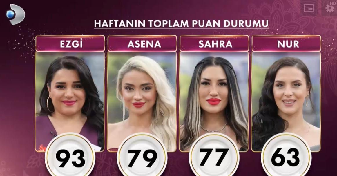 Hafta boyunca en yüksek puanı toplayarak tam 10 altın bileziğin sahibi ve haftanın birincisi 93 puanla Ezgi oldu. Ezgi’nin böylece 240 bileziği oldu. Asena ise 14 puanla bileziği kaçıran ve haftanın ikinci gelini olmayı başardı.