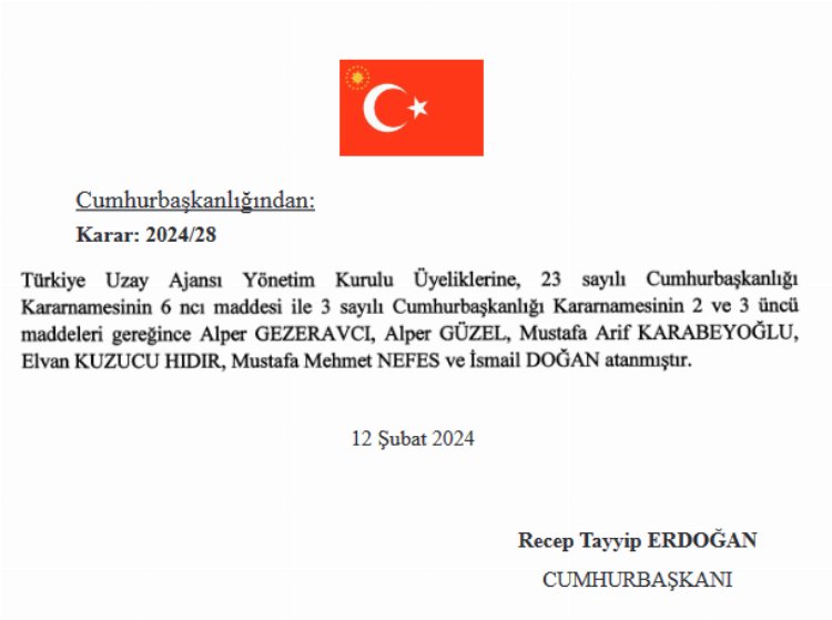 Bugünkü Resmi Gazete’de Cumhurbaşanı Erdoğan’ın imzasıyla yayımlanan atama kararları kapsamında Türkiye Uzay Ajansı Yönetim Kurulu üyeliğine 6 yeni isim atandı.
