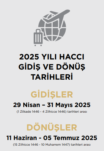 Diyanet’in açıkladığı takvime nazaran gidişler 29 Nisan – 31 Mayıs 2025 (1 Zilkade 1446 – 4 Zilhicce 1446) tarihleri ortasında olacak.
