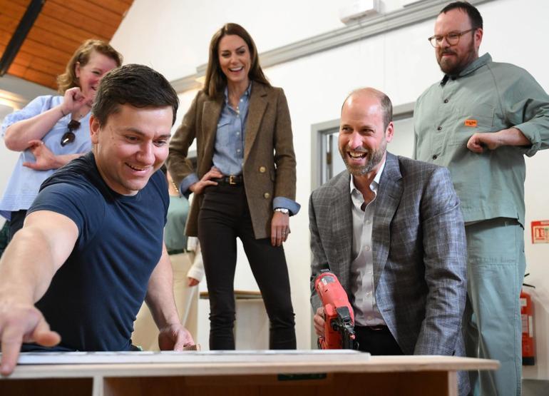Kate Middleton eline matkap ve çivi tabancası alarak merkezin tabelasını takmak için çalışanlara yardımcı oldu.