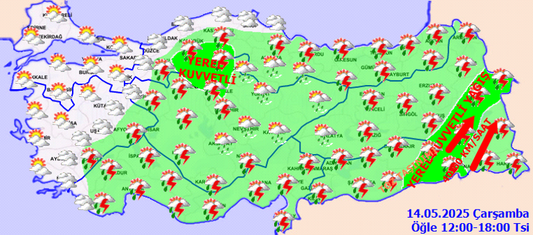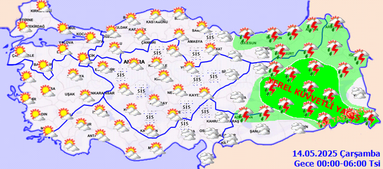 Meteoroloji Genel Müdürlüğü tarafından yapılan iddialara nazaran, ülkemiz genelinin kesimli ve çok bulutlu, Akdeniz, İç Anadolu, Batı Karadeniz’in iç kısımları, Orta ve Doğu Karadeniz, Doğu ve Güneydoğu Anadolu ile Afyonkarahisar ve Denizli etraflarının sağanak ve gök gürültülü sağanak yağışlı geçeceği iddia ediliyor. Yağışların, Doğu Anadolu’nun doğusu, Güneydoğu Anadolu’nun kuzey ve doğusu ile Çankırı, Kırıkkale, Bingöl, Tunceli, Elazığ ve Şanlıurfa etraflarında yer yer kuvvetli olması bekleniyor. Doğu Anadolu’nun güneydoğusu ile Güneydoğu Anadolu’da toz taşınımı görüleceği varsayım ediliyor. Gece ve sabah saatlerinde Doğu Akdeniz, İç Anadolu ve Orta Karadeniz’de pus ve yer yer sis bekleniyor.