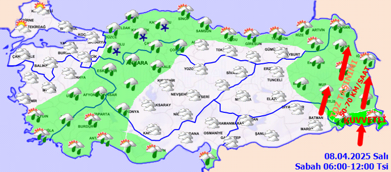 Çok bulutlu, bölge genelinin aralıklı yağmur ve sağanak, yer yer gök gürültülü sağanak yağışlı geçeceği iddia ediliyor. Yağışların; yarın (Salı) Muş, Bitlis, Hakkari ve Şırnak etraflarında yer yer kuvvetli olması bekleniyor. Rüzgârın, bölgenin doğusunda güney istikametlerden kuvvetli ve kısa periyodik fırtına (40-70 km/saat) biçiminde eseceği iddia ediliyor. Bölgenin doğusunda toz taşınımı bekleniyor.