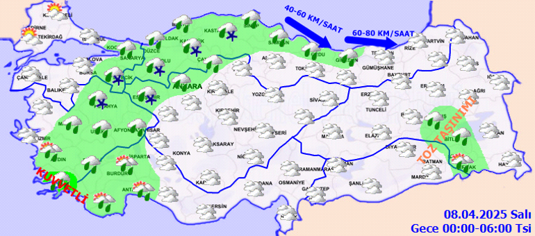 Çok bulutlu, aralıklı yağmurlu, yüksekleri karla karışık yağmur ve kar yağışlı