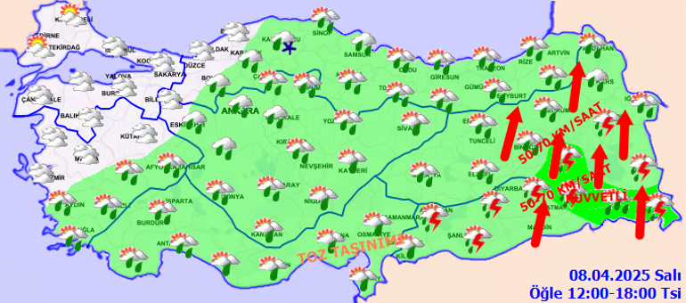 Çok bulutlu, bölge genelinin lokal olmak üzere sağanak ve gök gürültülü sağanak yağışlı geçeceği kestirim ediliyor. Yağışların; yarın (Salı) yer yer kuvvetli olması bekleniyor. Rüzgarın, bölgenin doğusunda güney taraflardan kuvvetli ve kısa vadeli fırtına (40-70 km/saat) halinde eseceği kestirim ediliyor. Bölgenin doğusunda toz taşınımı bekleniyor.