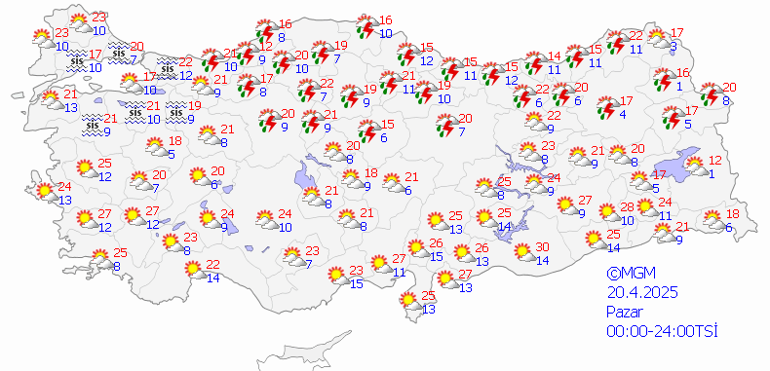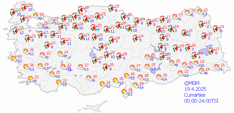 Parçalı ve az bulutlu, vakitle çok bulutlu, öğlen saatlerinden itibaren aralıklı sağanak ve gök gürültülü sağanak yağışlı