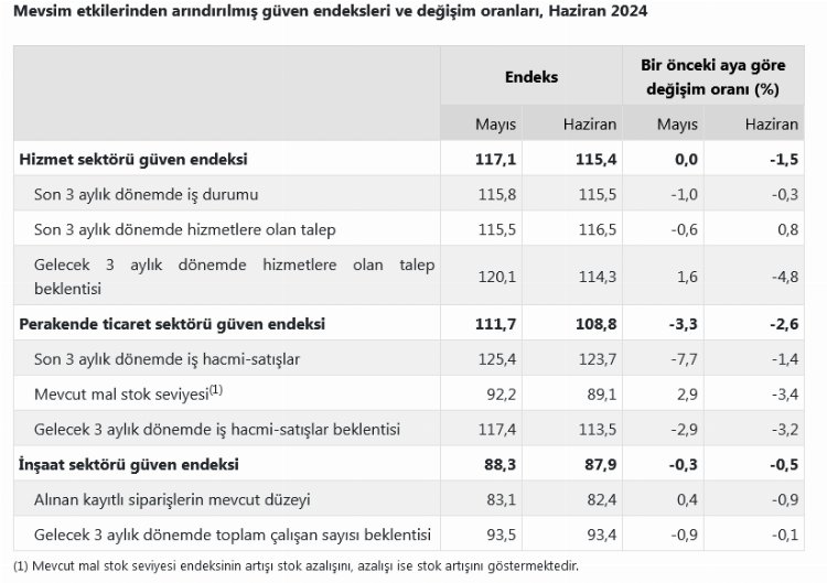 Mevsim etkilerinden arındırılmış güven endeksi Haziran ayında bir önceki aya göre; hizmet sektöründe yüzde 1,5 oranında azalarak 115,4 değerini, perakende ticaret sektöründe yüzde 2,6 oranında azalarak 108,8 değerini ve inşaat sektöründe yüzde 0,5 oranında azalarak 87,9 değerini aldı.