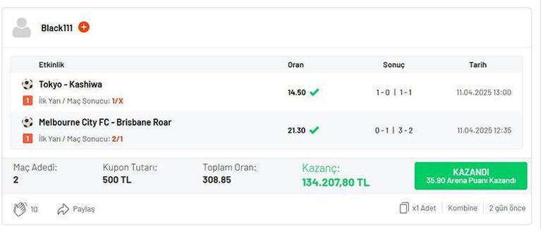 Misli üyesi, Japonya J1 Ligi’nde Tokyo ile Kashiwa ortasında oynanan müsabaka için İlk Yarı Sonucu 1 / Maç Sonucu X kestiriminde bulundu. Müsabakanın birinci golü dakika 35’te Tokyo’dan geldi. Kota Tawaratsumida’nın açtığı ortayı uzaklaştırmaya çalışan Kashiwa oyuncuları başarılı olamadı ve karışıklık ortasında Teruhito Nakagawa topu kaleyle buluşturmayı başardı. Kaleci her ne kadar topa uzansa da kalesini gole kapatmayı başaramadı. Tokyo böylece müsabakada 1-0 öne geçti ve müsabakanın birinci yarısı bu biçimde sona erdi. Misli üyesi, heyecanla konuk grubun golünü beklemeye başladı. İkinci yarı boyunca iki takım de çok net durumları değerlendiremedi. Tokyo artık konutundan galibiyetle ayrılacağını düşünürken, 90+4’te beklenen gol geldi. Kosuke Kinoshita ekibinin alandan 1 puanla ayrılmasını sağlayan golü müsabakanın son dakikasında attı. Misli üyesi böylelikle İlk Yarı Sonucu 1 / Maç Sonucu X varsayımıyla 14.50’lik oran tutturmuş oldu.