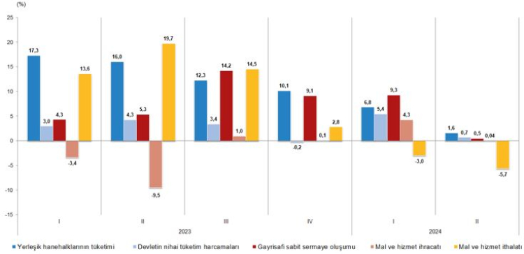 Yerleşik hanehalklarının nihai tüketim harcamaları yılın ikinci çeyreğinde bir önceki yılın aynı çeyreğine göre zincirlenmiş hacim endeksi olarak yüzde 1,6 arttı. Devletin nihai tüketim harcamaları yüzde 0,7, gayrisafi sabit sermaye oluşumu ise yüzde 0,5 arttı.