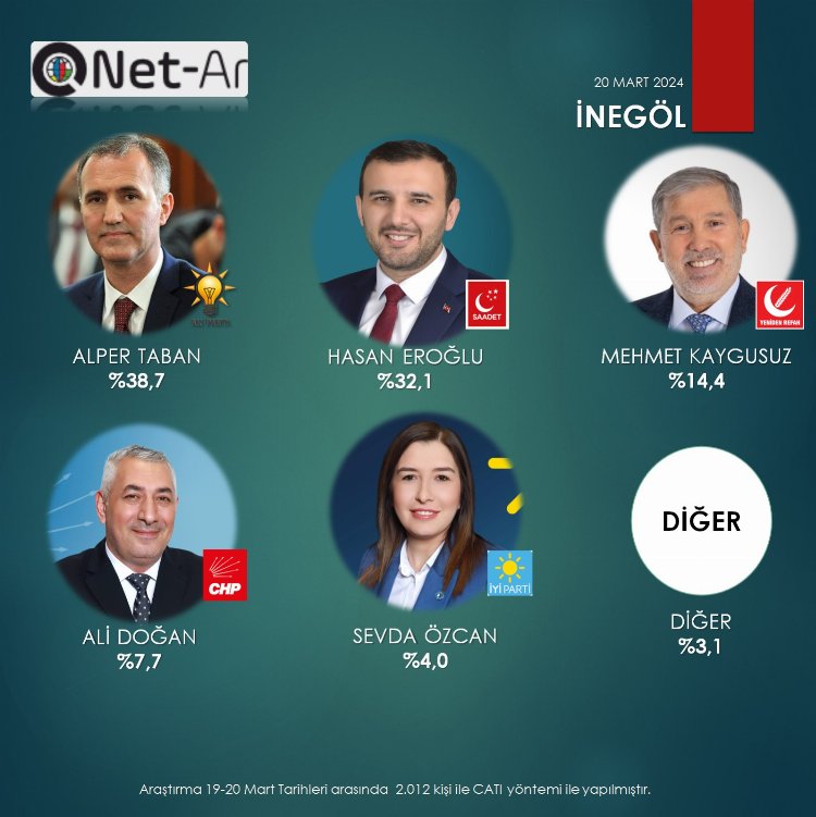 Saadet Partisi İnegöl Belediye Başkan Adayı Hasan Eroğlu Net-Ar’ın 2012 kişiyle yaptığı ankette yüzde 32,1’lik puanı İnegöl’ü 31 Mart 2024 Mahalli İdareler seçimlerine kilitledi. İnegöl’de ağırlığı olan Milli Görüş’ün tek temsilcisi Saadet Partisi’nin seçmen gözündeki bu başarısı diğer 16 ilçe teşkilatını da tetikledi.