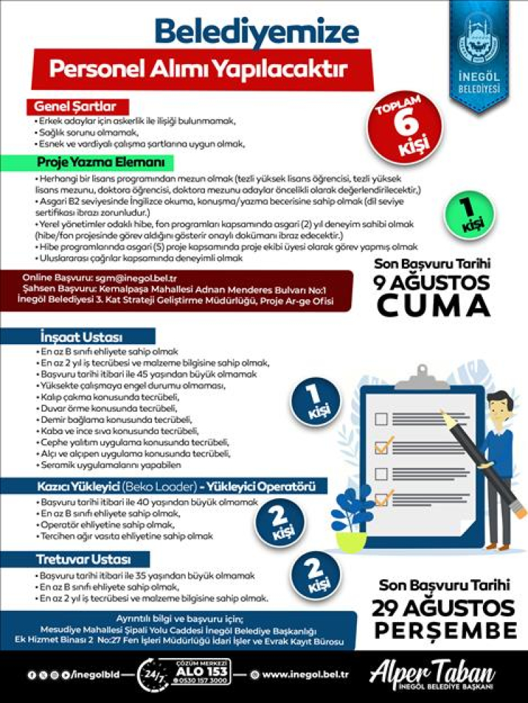 BURSA (İGFA) – İnegöl Belediyesi’nin personel alımına ilişkin yapılan açıklamada şu ifadelere yer verildi: “Kurumumuz bünyesinde istihdam edilmek üzere 4 ayrı alanda görevlendirilecek personel alımı yapılacak. İlçe halkımıza en iyi hizmeti sunmak adına yapılan alım kapsamında; 1 Proje Yazma Elemanı, 1 İnşaat Ustası, 2 Kazıcı Yükleyici (Beko Loader) -Yükleyici Operatörü ve 2 Tretuvar Ustası alınacak. Başvuruda bulunmak isteyen vatandaşlarımız Proje Yazma Elemanı alımı için 09 Ağustos Cuma saat 17.00’a kadar Kemalpaşa Mahallesi Adnan Menderes Bulvarı No:1 İnegöl Belediye Başkanlığı adresinde bulunan Strateji Geliştirme Müdürlüğü’ne bizzat başvuru yapabilecek. İnşaat Ustası, Kazıcı Yükleyici (Beko Loader) Yükleyici Operatörü ve Tretuvar Ustası alımı için ise 29 Ağustos Perşembe günü saat 17.00’ a kadar Mesudiye Mahallesi Şipali Yolu Caddesi İnegöl Belediye Başkanlığı Ek Hizmet Binası 2 No: 27 adresinde Fen İşleri Müdürlüğü Hizmet Binasına gelerek İdari İşler ve evrak kayıt bürosuna bizzat başvuru yapabilecek.”