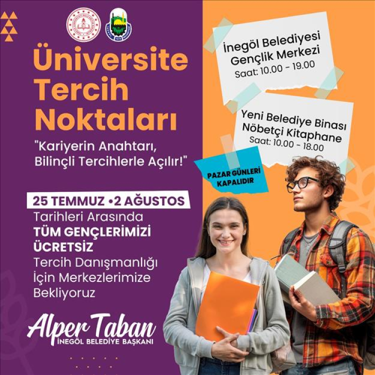 Gençlerin her zaman yanında olan İnegöl Belediye Başkanı Alper Taban, 25 Temmuz Perşembe günü itibariyle iki noktada kurulacak merkezlere ilişkin açıklama yaparak tüm öğrencileri bu alanlardan faydalanmaya davet etti. Başkan Alper Taban, iki ayrı noktada üniversite tercih merkezi kurulacağını kaydederek; “Öğrencilerimizin geleceğini etkileyecek bu kararda en doğru adımı atmaları adına yanlarında olmak istedik. Bu nedenle hem İnegöl Belediyesi Gençlik Merkezimizde hem de Yeni Belediye Binası Nöbetçi Kitaphane’de iki ayrı tercih merkezi kuracağız. Tüm öğrencilerimizi ücretsiz danışmanlık hizmetinden faydalanmak üzere tercih noktalarımıza bekliyoruz” dedi.