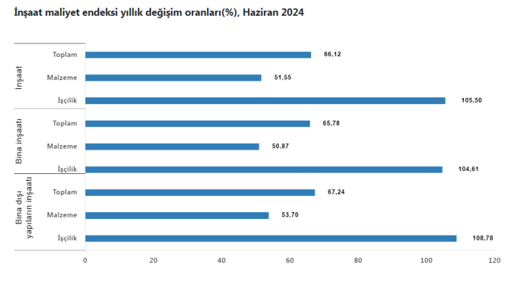 İnşaat maliyet endeksi, 2024 yılı Haziran ayında bir önceki aya göre yüzde 0,40 arttı, bir önceki yılın aynı ayına göre yüzde 66,12 arttı. Bir önceki aya göre malzeme endeksi yüzde1,01 arttı, işçilik endeksi yüzde 0,80 azaldı. Ayrıca bir önceki yılın aynı ayına göre malzeme endeksi yüzde 51,55 arttı, işçilik endeksi yüzde105,50 arttı.