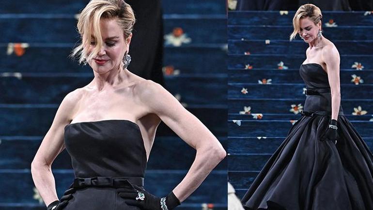 Nicole Kidman görünümünü siyah topuklu ayakkabılar, uyumlu kısa eldivenler ve elmas kakmalı sarkan küpelerle tamamladı.
