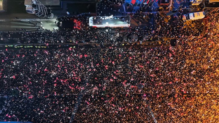 Bir kez daha İstanbul Büyükşehir Belediye (İBB) Başkanı seçilen Ekrem İmamoğlu, CHP İstanbul İl Başkanlığı’nda yaptığı ikinci açıklamanın ardından Saraçhane’yi hınca hınç dolduran 10 binlerce yurttaşla buluştu.