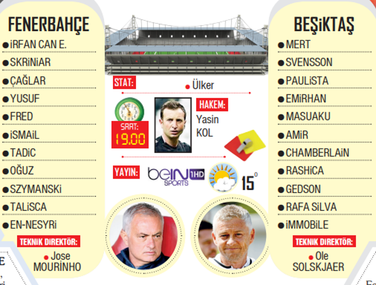 Ligde 17 haftadır yenilmeyen sarı lacivertlilerin teknik yöneticisi Jose Mourinho, Muhteşem Lig’de birinci derbi galibiyetini elde etmeyi amaçlıyor. Türkiye mesleğinde çıktığı birinci derbide Galatasaray’ı 2-1 yenmenin sevincini yaşayan Ole Gunnar Solskjaer ise Fenerbahçe’ye karşı birinci sefer imtihan verecek.