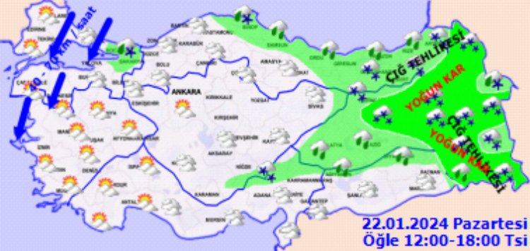 ANKARA (İGFA) – Meteoroloji Genel Müdürlüğü tarafından yapılan son değerlendirmelere göre: Ülkemiz genelinin çok bulutlu, Orta Karadeniz kıyıları, Doğu Karadeniz, Doğu Anadolu, Güneydoğu Anadolu’nun doğusu ile İstanbul, Kocaeli, Bursa, Yalova ,Karaman, Kahramanmaraş, Sivas, Sinop, Adıyaman çevreleri ve Balıkesir’in kuzeyinin yağışlı geçeceği tahmin ediliyor. Kıyı kesimler ile Güneydoğu Anadolu’da yağmur ve sağanak; diğer yerlerde karla karışık yağmur ve yükseklerinde kar şeklinde görülmesi beklenen yağışların; Doğu Karadeniz’in iç kesimlerinin yüksekleri, Doğu Anadolu’nun doğusu ve Siirt’in yükseklerinde kuvvetli ve yer yer yoğun kar şeklinde olması bekleniyor. Kuzey, iç ve doğu kesimlerde pus ve yer yer sis görülmesi bekleniyor. Doğu Karadeniz’in iç kesimleri ile Doğu Anadolu’nun kuzey ve doğusunda çığ tehlikesi bulunmaktadır.