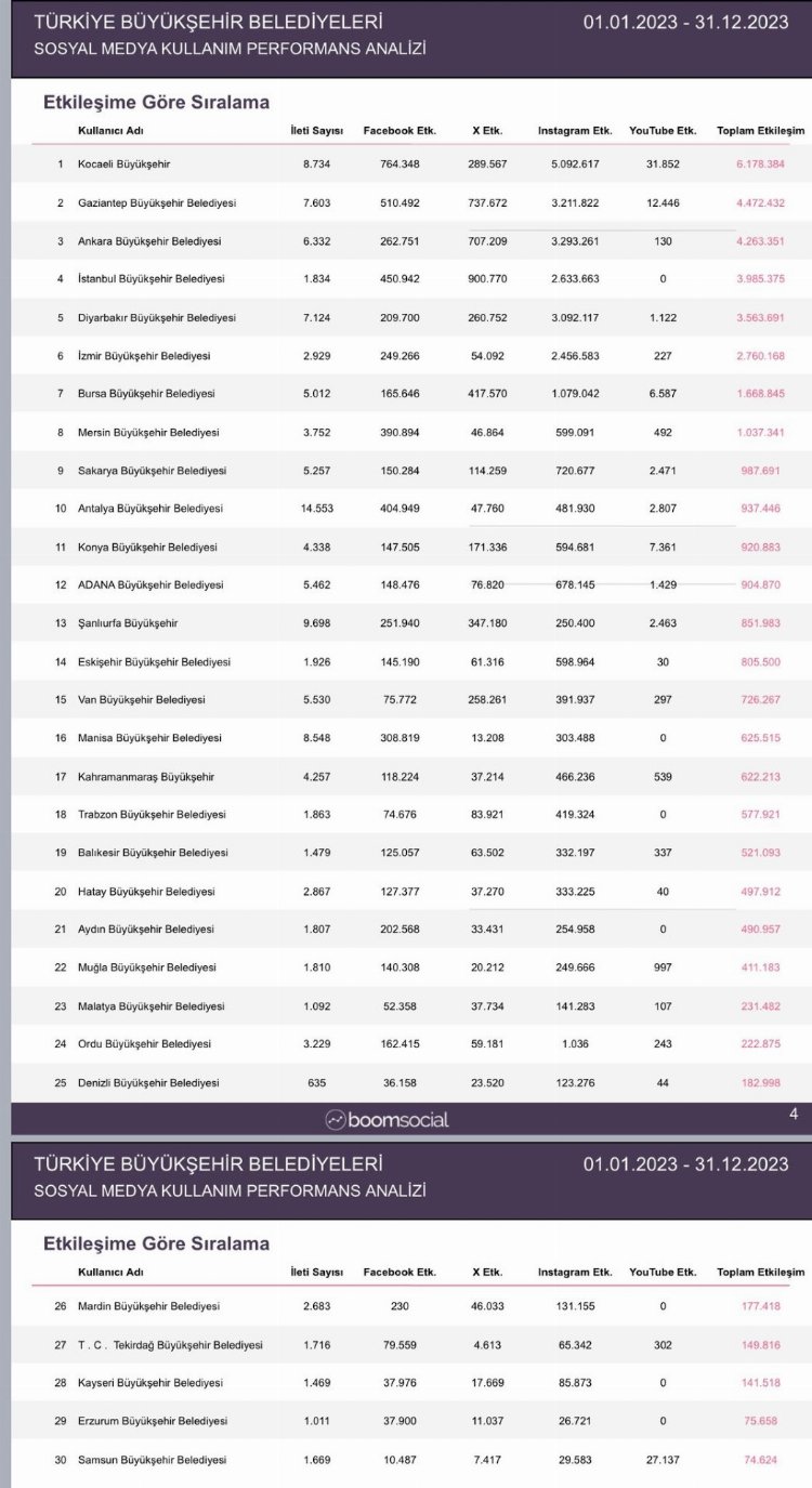 Tüm sosyal platformlarda @KOCAELIBLD adıyla takip edilen Kocaeli Büyükşehir Belediyesi’nin Facebook, Instagram, YouTube ve (Twitter) X’te 2023 yılında aldığı toplam 6 milyon 178 bin 384 etkileşim ile birinci olduğu sıralamada, Gaziantep ikinci, Ankara Büyükşehir üçüncü, İstanbul Büyükşehir dördüncü, Diyarbakır Büyükşehir Belediyesi ise beşinci oldu.